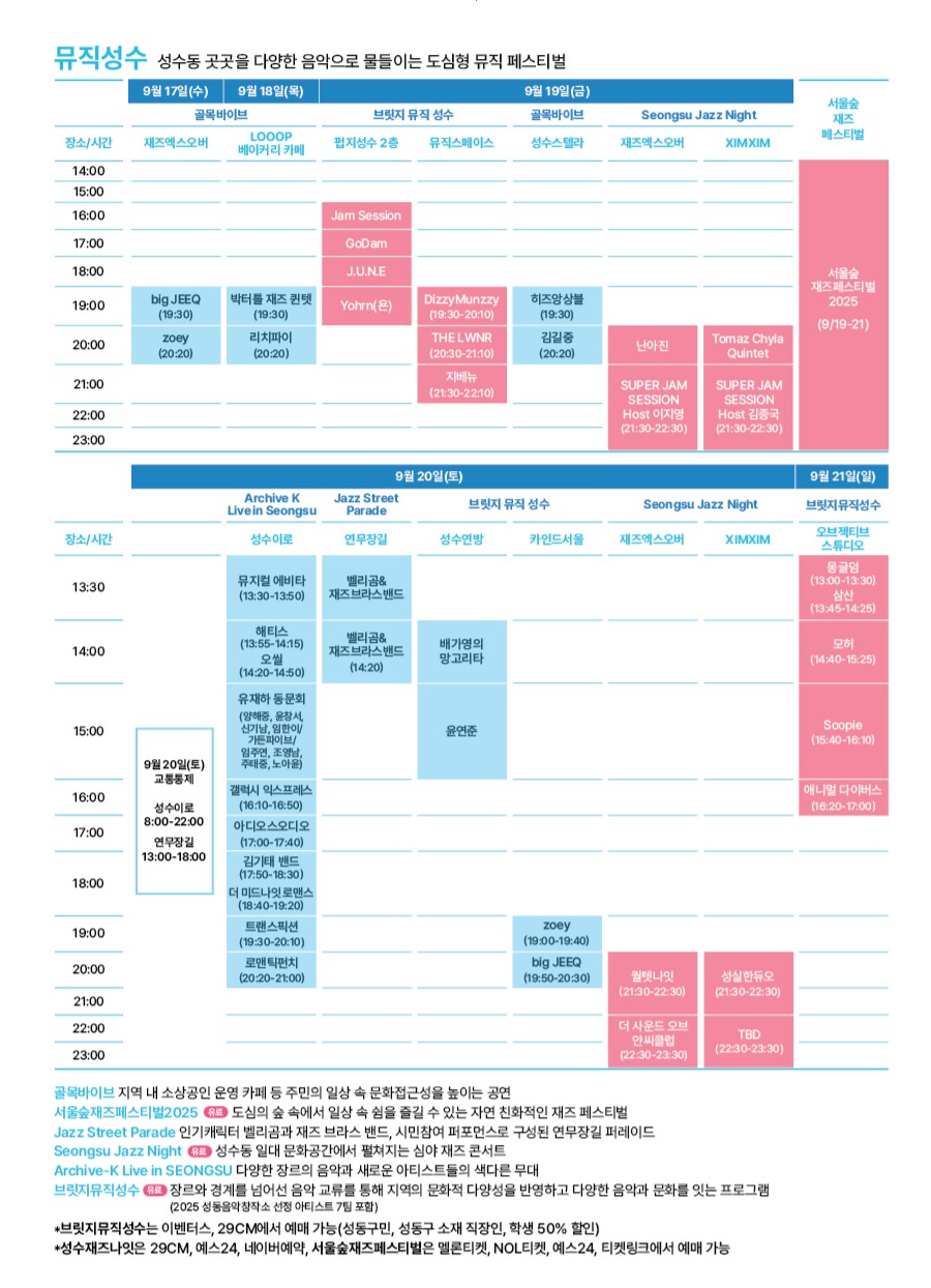 장 소 : 재즈엑스오버, LOOOP베이커리카페, 성수스텔라, XIMXIM, 펍지성수, 오브젝티브스튜디오, 뮤직스페이스, 카인드서울, 성수연방, 서울숲가족마당, 연무장길일대, 성수역 3번출구 성수이로